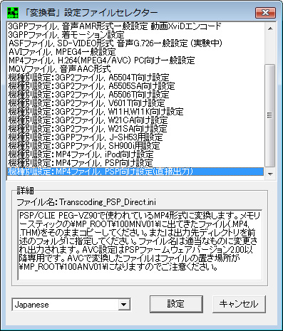 機種別設定で「MP4ファイル、PSP向け設定(直接出力)」をクリックして、設定ボタンをクリックします。