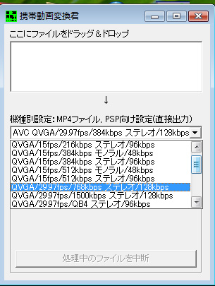 おすすめは、QVGA/29.97fps/768kbps ステレオ/128kbpsです。